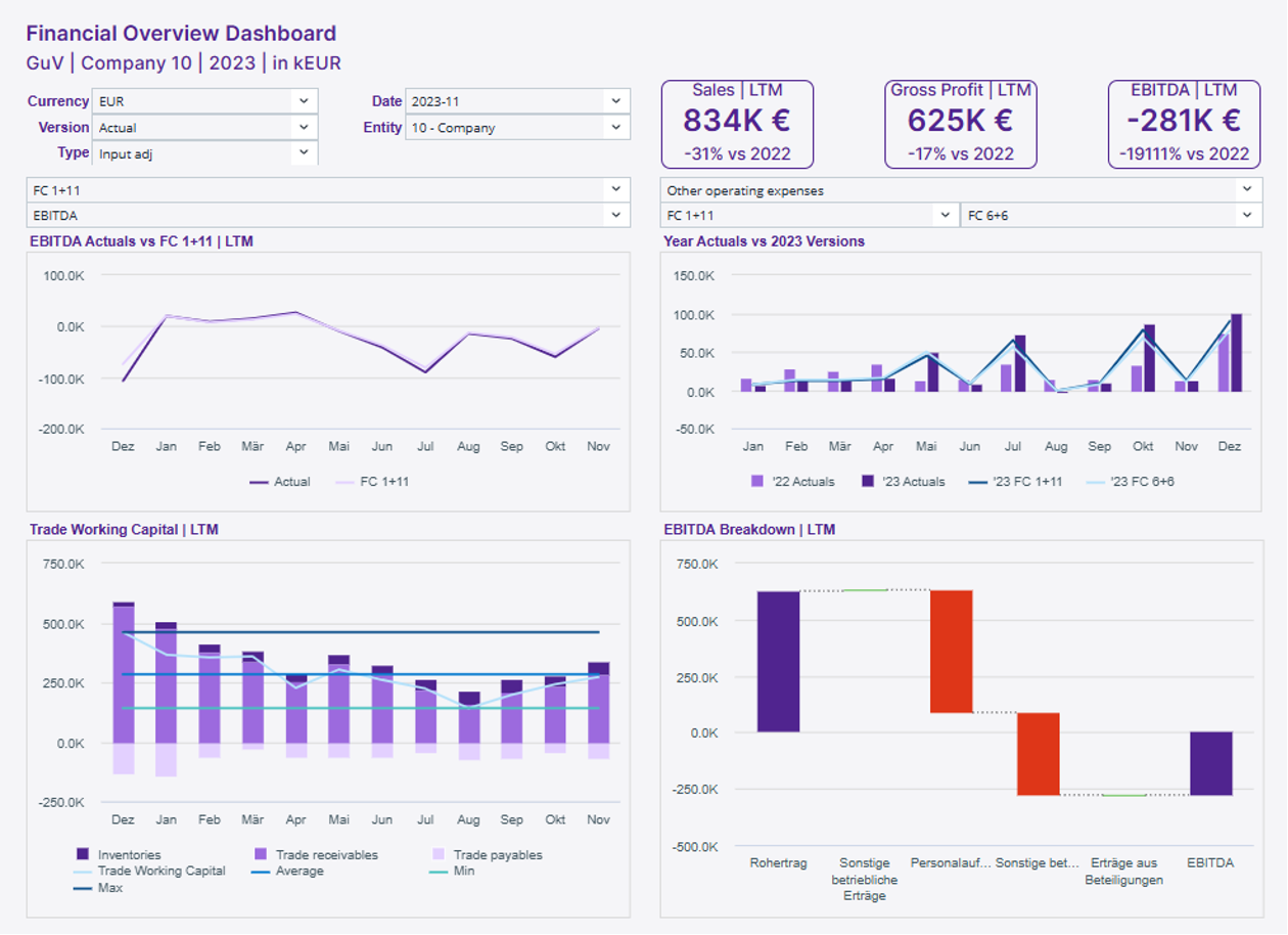 Die Dashboards der econio Solution verwandeln komplexe Daten in visuell ansprechende, umsetzbare Erkenntnisse und bieten Entscheidungsträgern eine intuitive Echtzeit-Ansicht der wichtigsten Kennzahlen. Unsere Dashboards basieren auf den neuesten Business Intelligence (BI) Prinzipien und sind so konzipiert, dass sie das Wesentliche hervorheben - seien es finanzielle KPIs, operative Performance oder strategische Trends. CFOs und das gesamte Management-Team können vom ersten Tag an auf diese vorkonfigurierten Dashboards zugreifen und profitieren von einem hohen Maß an Funktionalität, die es ihnen ermöglicht, die Performance des Unternehmens auf einen Blick zu verfolgen und zu überwachen. Unsere Dashboards sind sofort einsatzbereit, können aber im Laufe der Zeit erweitert und angepasst werden, um den sich ändernden Anforderungen Ihres Unternehmens gerecht zu werden. Dieser Ansatz stellt sicher, dass Sie immer Zugriff auf relevante und aktuelle Informationen haben, ohne die standardisierte Integrität der Lösung zu gefährden. Auf diese Weise können sich Unternehmen schnell an neue Herausforderungen und Chancen anpassen.