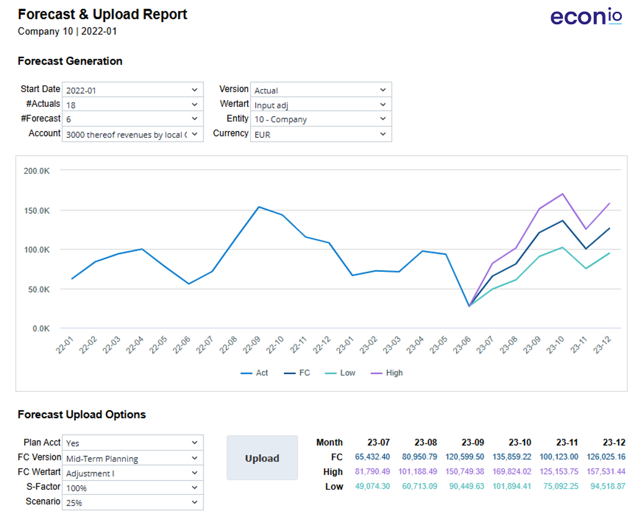 Die econio-Solution vereinfacht Planung und Forecasting und bietet Unternehmen eine skalierbare Plattform für eine schnelle und effektive Finanzplanung und -analyse (FP&A). Die Planungsmodelle von econio sind so konzipiert, dass sie sich nahtlos in bestehende Vorsysteme des Kunden integrieren lassen. Sie unterstützen präzise Budgetierung, Forecasting und Szenarioanalysen und ermöglichen es CFOs und Finanzteams, proaktive Entscheidungen zu treffen, die das Unternehmenswachstum fördern.
